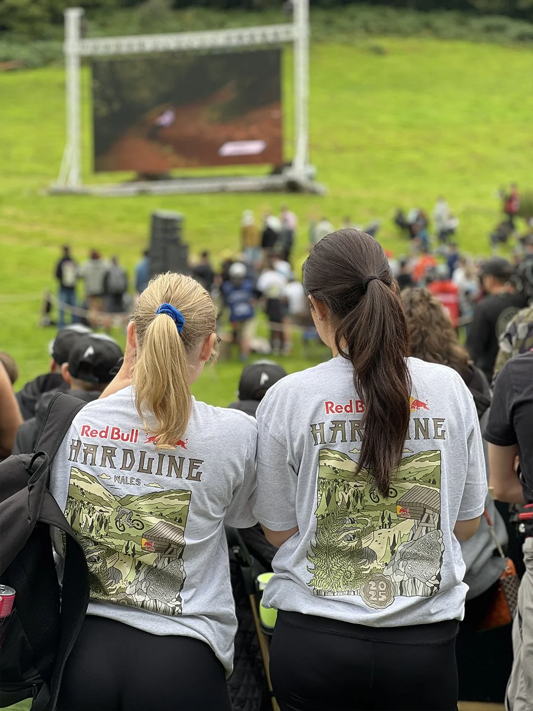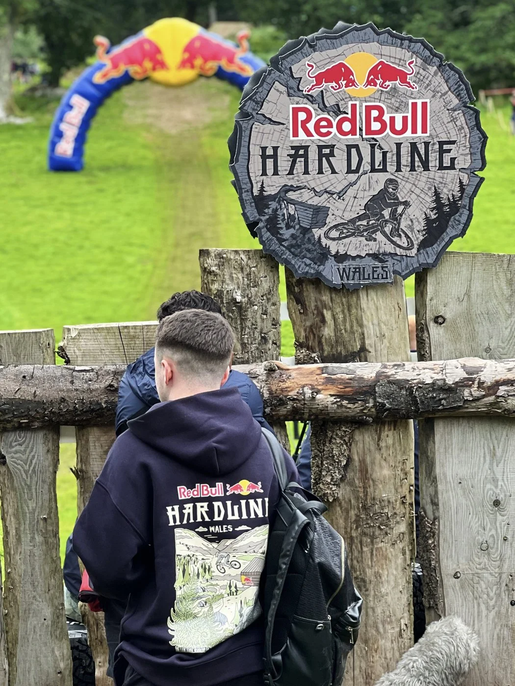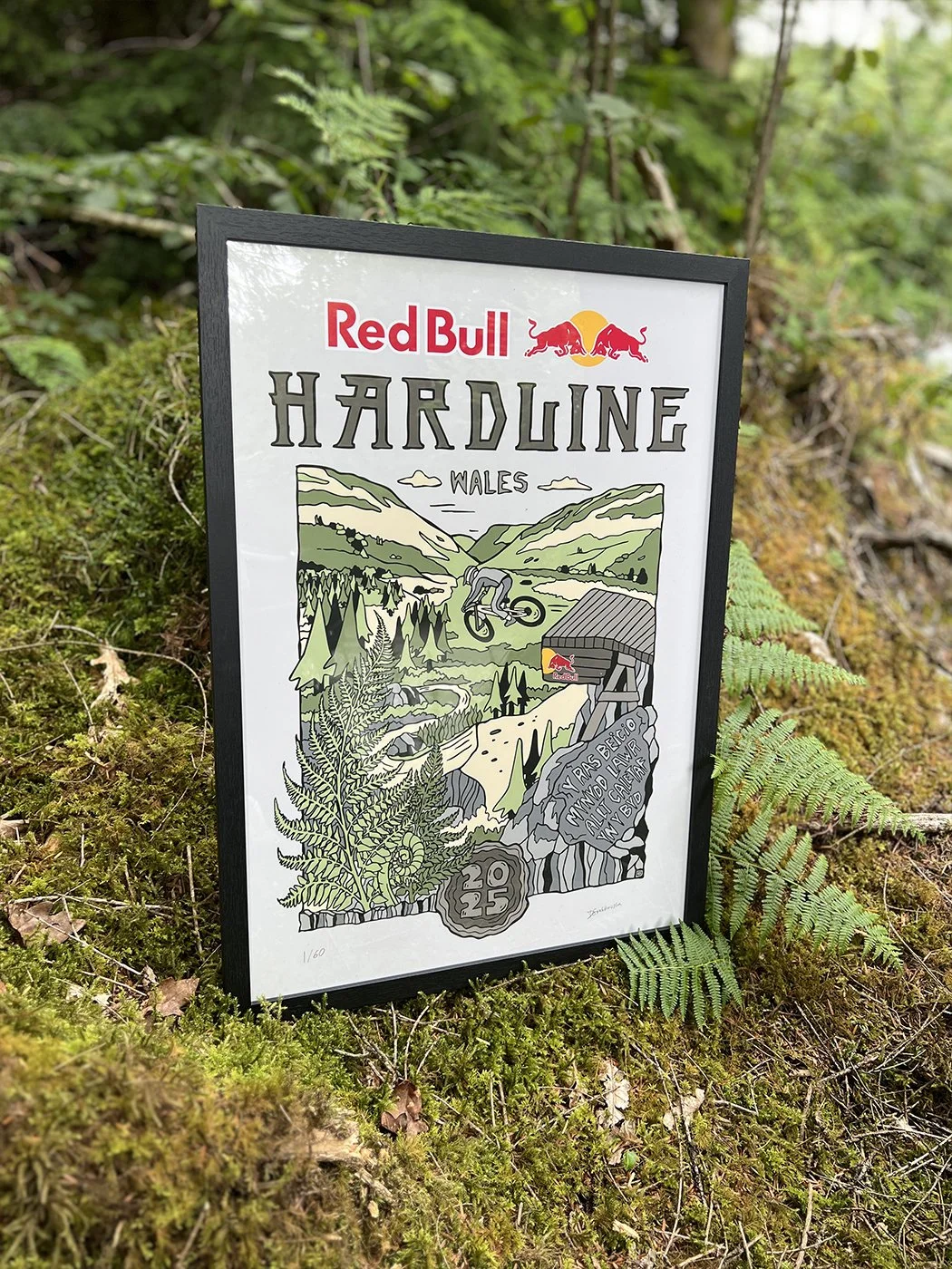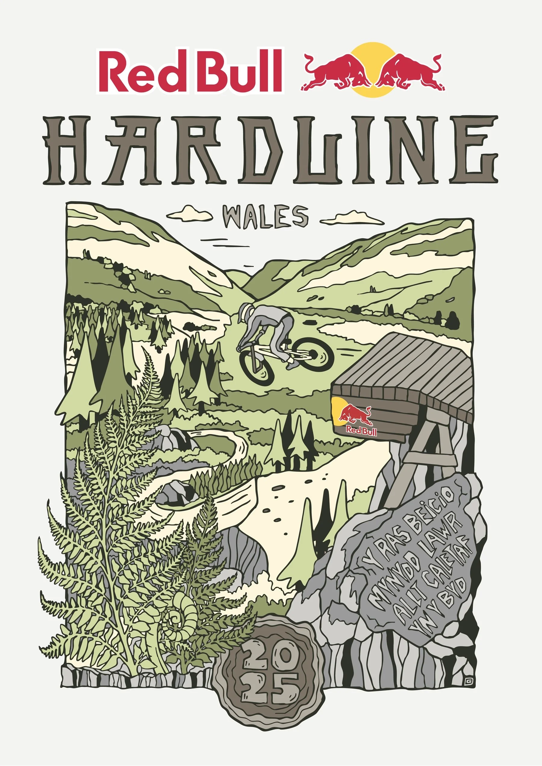 The Red Bull Hardline event, held annually in mid Wales, is renowned as one of the most demanding mountain bike races globally. The 2025 artwork captures a rider on the iconic Red Bull Hardline Road Gap, surrounded by the Welsh landscape and the site's signature elements - the rolling hills, ferns, pine trees, and rocks. Carved into the rock is Red Bull Hardline's slogan, "The world's toughest downhill MTB race" translated into Welsh, "Y ras beicio mynydd lawr allt caletaf yn y byd".
