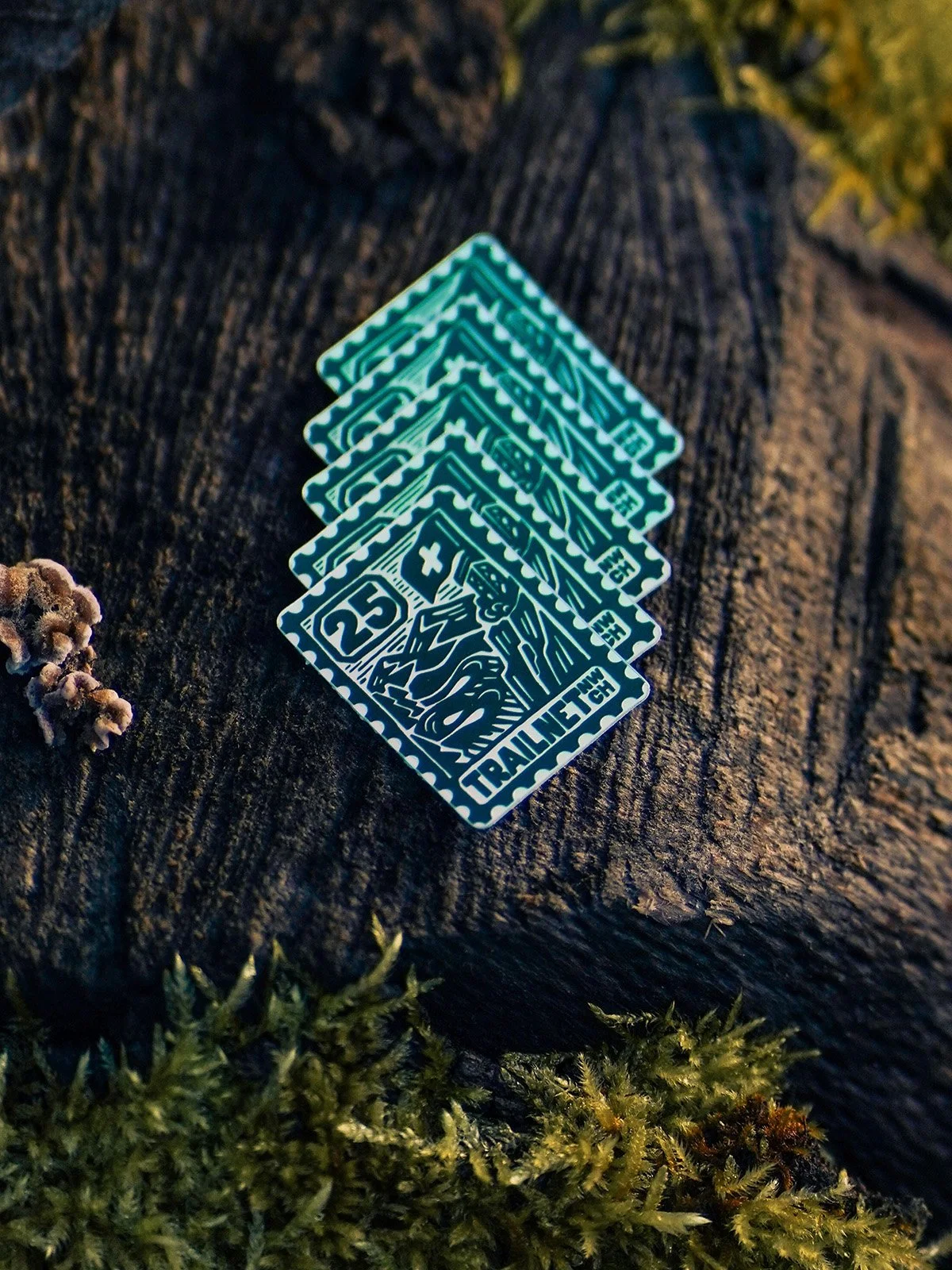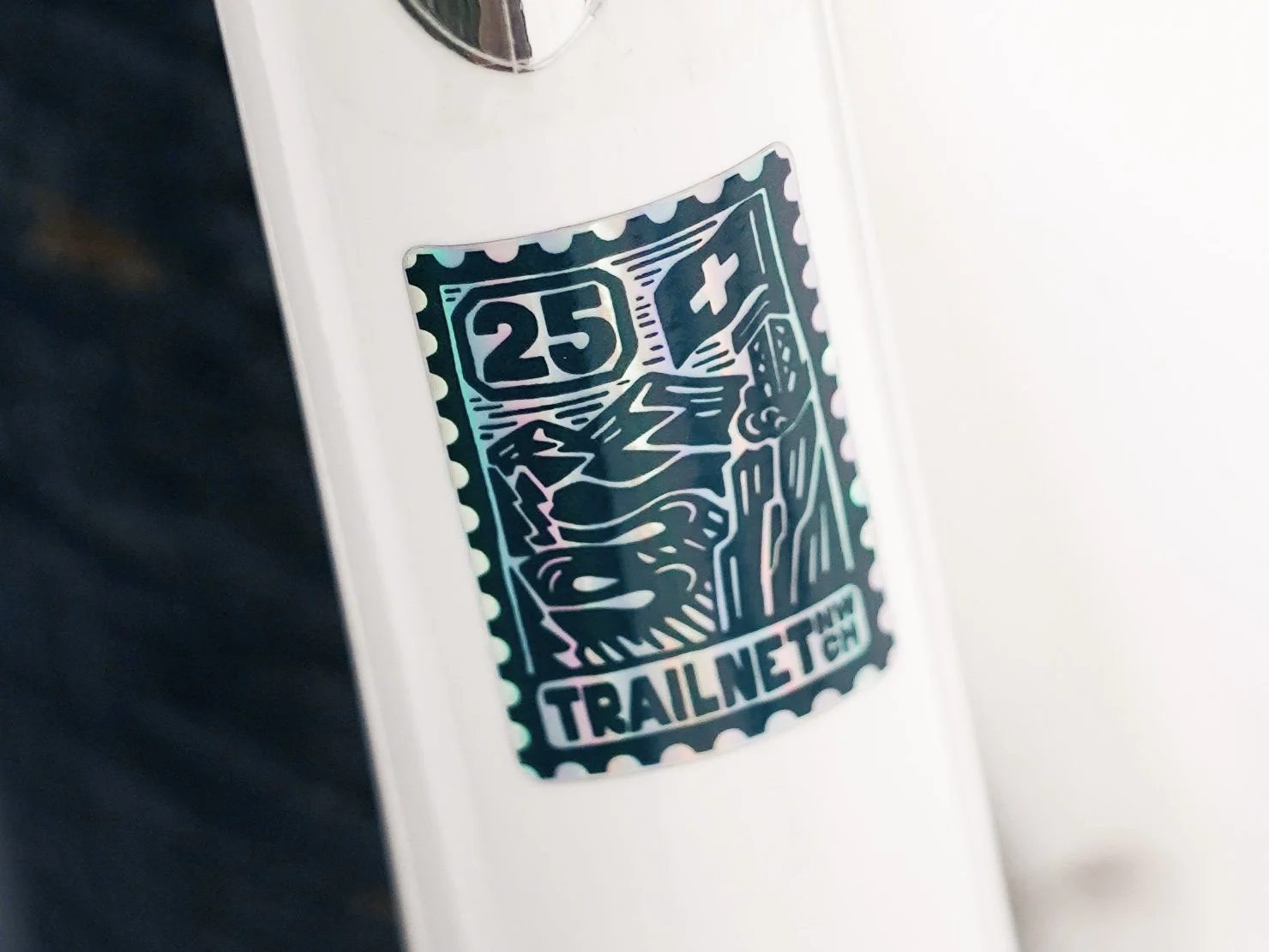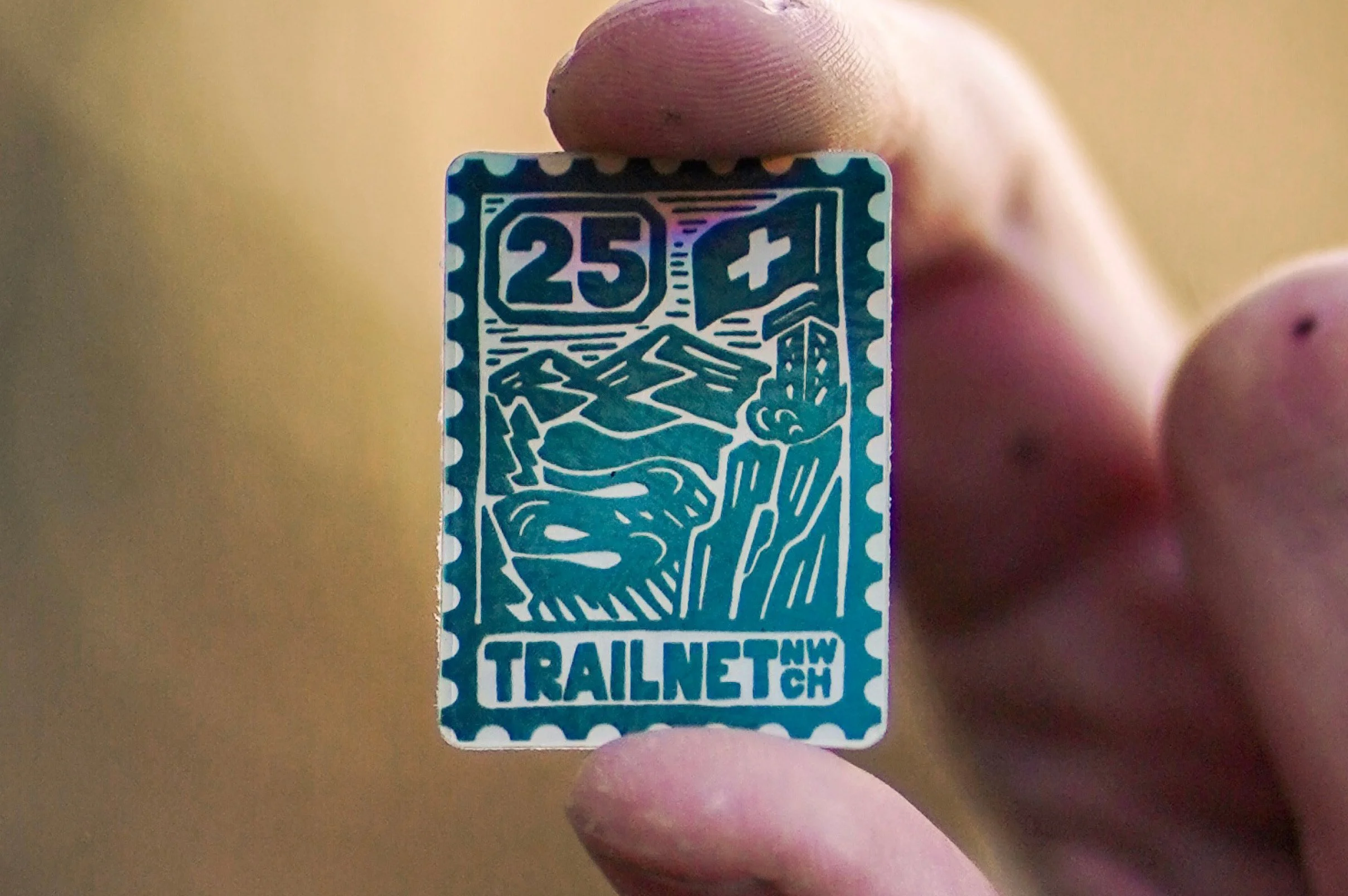 Trailnet Nordwestschweiz, the largest bike club in north-western Switzerland, manages a vast network of natural trails and supports local trail builders. The Season Pass, in a form of a stamp-sized sticker, helps fund this critical work, ensuring trails remain well maintained and legally accessible. The 2025 design draws inspiration from the local Gempen mountain and features the iconic tower with a Swiss flag, views of the hills and flowy trails, and is stylised to resemble a vintage stamp.